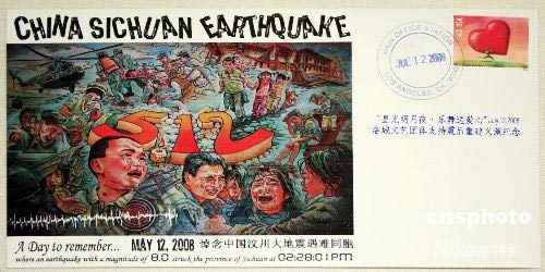 當地時間7月12日,美國洛杉磯華人華僑,為紀念中國四川省汶川縣發生8級地震,悼念地震遇難同胞,舉辦了“星光明月夜,樂舞送愛心”洛城文藝團體支持震后從建紀念活動,并發行首日封一枚。圖為首日封設計者魏進發。中新社發 金立冬 攝