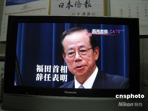 9月1日晚9時(shí)30分,日本首相福田康夫在首相官邸舉行記者會(huì)見(jiàn),向國(guó)民表明決定辭職。圖為日本電視臺(tái)直播福田首相決定辭職的記者會(huì)。福田康夫2007年9月26日接替安倍晉三擔(dān)任首相,在任期不滿(mǎn)一年。 中新社發(fā) 段躍中 攝