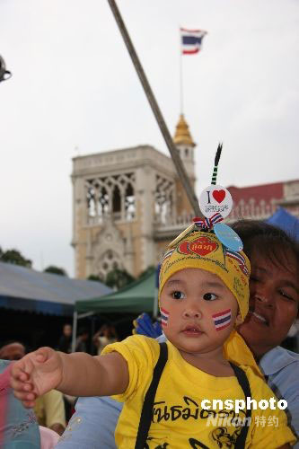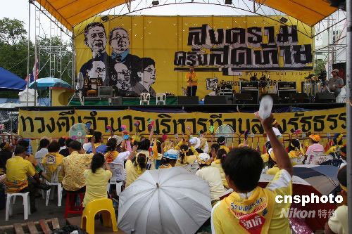 盡管泰國憲法法院九月九日已經判決總理沙瑪因主持電視節目違背憲法無資格當總理,但占據總理府的民盟示威者依然沒有離去。中新社發 顧時宏 攝