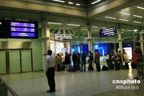 圖為11日晚,警察封鎖了歐洲之星火車的出發(fā)站臺(tái),現(xiàn)場有乘客焦急等候。