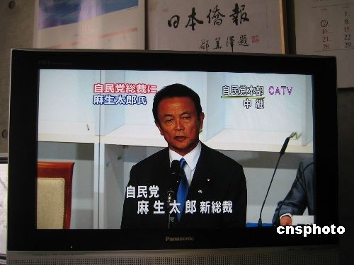9月22日下午,日本自民黨在東京舉行總裁選舉投票,麻生太郎以351票高票當選第23代日本自民黨總裁。圖為當選新總裁的麻生太郎致詞。其他四位候選人與謝野馨以66票位居第二,小池百合子、石原伸晃和石破茂票數(shù)分列后三位。中新社發(fā) 段躍中 攝