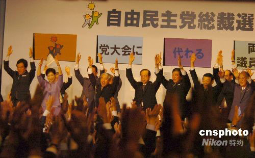9月22日下午,日本自民黨總裁選舉中,第4次參選的麻生太郎以351票的高票當選該黨第23任總裁。中新社發 朱沿華 攝
