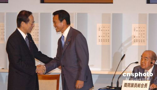 圖為前總裁、現任首相福田康夫向新當選的麻生太郎表示祝賀。