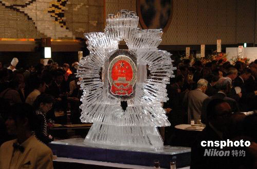 9月26日晚,中國駐日大使崔天凱在東京新大谷飯店舉行盛大的國慶招待會(huì),與日本各界人士、在日華僑華人代表共慶中華人民共和國成立五十九周年,一千五百余人應(yīng)邀出席。會(huì)場(chǎng)入口處,一座大型中國國徽冰雕引人注目。據(jù)介紹,這是新大谷飯店為祝賀中國國慶特別制作的。中新社發(fā) 段躍中 攝