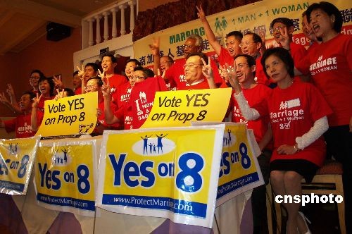 當(dāng)?shù)貢r(shí)間10月16日,美國(guó)南加州華人基督徒支持加州婚姻修憲提案,倡導(dǎo)一男一女婚姻制。中新社發(fā) 盧威 攝