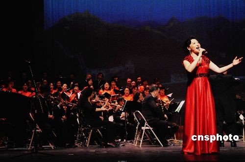 華盛頓黃河藝術團藝術家在當地時間十月二十五日晚的演出中用中國改革開放歷程中涌現的歌曲,抒發中國人共同經歷的改革開放不平凡的三十年,引起了海外華人強烈共鳴。圖為黃河藝術團藝術家演唱《好一個中國大舞臺》贏得雷鳴掌聲。中新社發 邱江波 攝