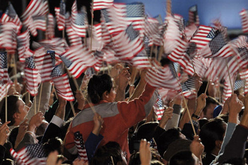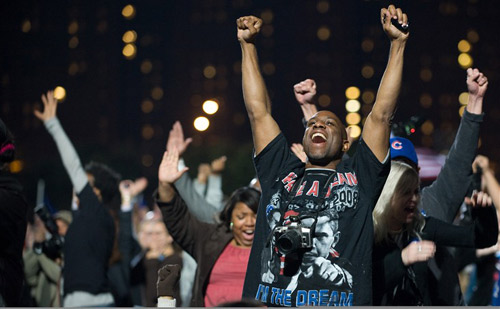 美國總統(tǒng)選舉結果揭曉,奧巴馬已經贏得足夠的選舉人票(270票),取得本屆美國總統(tǒng)大選的勝利。他將成為美國首位黑人總統(tǒng)。圖為支持者慶祝奧巴馬的獲勝