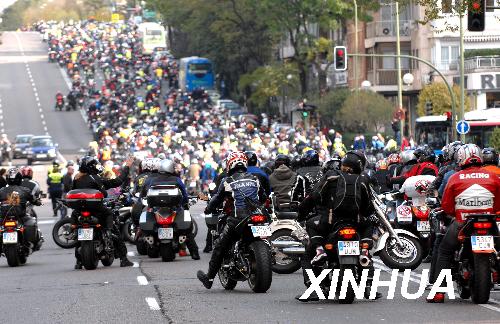 11月8日,眾多摩托車手在西班牙首都馬德里市中心街道參加大游行。當日,來自西班牙各地的上萬名摩托車手在首都馬德里參加大游行,呼吁政府部門改善道路交通條件,保障摩托車出行安全。據(jù)統(tǒng)計,西班牙2007年共有500余名摩托車手在交通事故中喪生。新華社記者陳海通攝