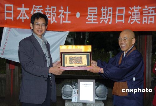 11月9日,日本僑報社創(chuàng)辦的星期日漢語角在東京西池袋公園舉行第65次交流會。會上舉行了第2屆小島康譽國際貢獻獎頒獎儀式。著名日中友好人士小島康譽向為促進日中民間交流作出貢獻的《日本僑報》總編輯、漢語角創(chuàng)辦人段躍中頒發(fā)了一幅以中國新疆尼雅遺址出土的東漢“五星出東方利中國”古錦為原型的金箔藝術品和100萬日元。中國駐日使館友好交流參贊孫美嬌和中日兩國媒體、經(jīng)濟界、友好團體及旅日留學生代表等約80人出席了當天的頒獎儀式。中新社發(fā) 日本僑報社 攝