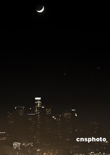 當(dāng)?shù)貢r間十二月一日晚七時許,洛杉磯市中心上空西南方出現(xiàn)“雙星拱月”的少見天象,耀眼的金星(左)和明亮的木星(右)伴隨著一彎新月在夜空中格外醒目。據(jù)天文學(xué)家介紹,這三個天體盡管每年有一次相遇的機(jī)會,但肉眼可見的時候卻很少。中新社發(fā) 張煒 攝
