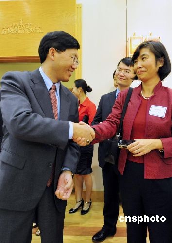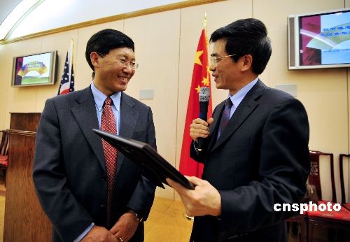 當(dāng)?shù)貢r(shí)間十二月五日,中國(guó)駐舊金山總領(lǐng)事高占生向美國(guó)加州大學(xué)戴維斯分校華裔教授潘忠禮(左)頒發(fā)賀狀,祝賀他獲得2007年度美國(guó)青年科學(xué)家總統(tǒng)獎(jiǎng)。今年春天,潘忠禮教授曾獲得美國(guó)農(nóng)業(yè)部2007年度赫爾伯特-拉波爾特杰出中青年農(nóng)業(yè)研究科學(xué)家獎(jiǎng)。中新社發(fā) 陳鋼 攝