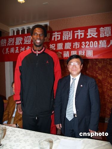 當(dāng)?shù)貢r間12月6日,重慶市副市長譚棲偉率重慶市政府代表團(tuán)飛抵美國洛杉磯,受到洛杉磯僑界的熱烈歡迎,美國職業(yè)藍(lán)球NBA球星格林也趕來迎接中國客人,并與譚棲偉副市長合影留念。中新社發(fā) 盧威 攝