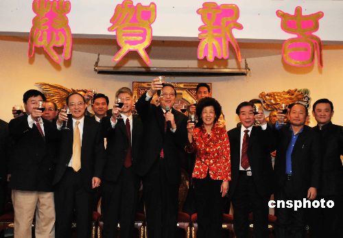 當地時間1月16日晚,中國駐美大使周文重(前排中)和夫人謝淑敏女士(前右四)在華盛頓中國城,向來自海峽兩岸的大華府十八個最大僑社領袖以及大華府地區及廣大旅美僑胞祝賀牛年新春。圖為周大使夫婦和僑社領袖們向廣大僑胞敬酒賀新春。中新社發 邱江波 攝