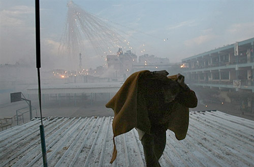 以軍1月17日再次襲擊加沙北部一所聯合國學校,一名婦女和一名兒童喪生,以軍坦克和巴勒斯坦武裝分子在學校附近激烈交火。圖為一名巴勒斯坦人在戰火中逃生。