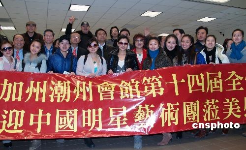 2月7日,江蘇省中國明星藝術團一行34人從美國紐約飛抵洛杉磯,作“心系中華美洲情”巡回慰問演出。他們在機場受到南加州潮洲會館會長佘紹漢、副會長林淦花、監事長鄭克成等熱烈歡迎。中新社發 盧威 攝