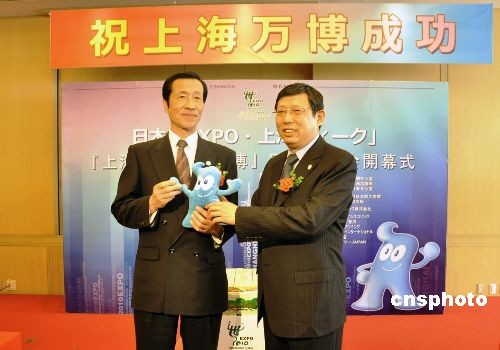 4月13日下午,日本“上海世博推介周”中的重要環(huán)節(jié)——“上海與上海世博會”圖片展,在東京羽田機場開幕。圖片展將持續(xù)到本月底,計劃在羽田機場、京濱急行列車“世博號”以及其他東京地鐵列車和站臺上展出反映上海城市風情、市民生活、世博籌備等各方面的圖片共700幅,以讓日本市民直觀、生動地了解上海與上海世博會的最新情況。圖為上海世博會執(zhí)委會常務副主任、上海市常務副市長楊雄(右),向東京都副知事菅原秀夫贈送上海世博會吉祥物海寶。中新社發(fā) 關妍 攝