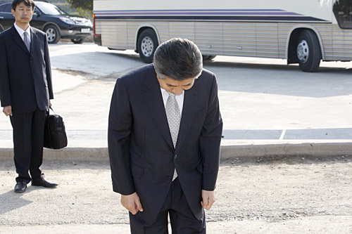 4月30日,韓國(guó)前總統(tǒng)盧武鉉從位于首都首爾東南約450公里的家中離開(kāi),準(zhǔn)備接受檢察機(jī)關(guān)的質(zhì)詢時(shí)向媒體記者鞠躬。