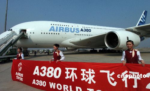 空中客車A380飛機環球飛行之旅,十月二十三日抵達廣州,拉開了為期一周的中國大陸演示飛行的序幕。A380將在中國大陸的廣州、上海、北京三地進行體驗飛行和靜態演示。中新社發 柯小軍 攝