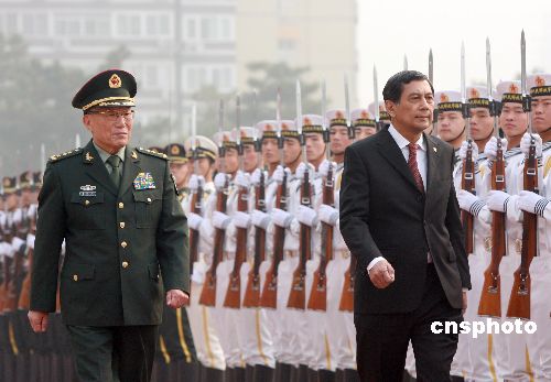 十一月七日,中華人民共和國中央軍委副主席、國務委員兼國防部長曹剛川在北京舉行儀式歡迎印度尼西亞國防部長尤沃諾·蘇達爾索諾,隨后雙方舉行了會談。中新社發 廖文靜 攝