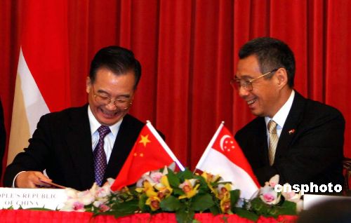 到訪的中國國務院總理溫家寶十一月十八日在新加坡總統府與新加坡總理李顯龍共同簽署了兩國合作建設中新天津生態城框架協議。“生態城”項目的地點選定在中國天津。中新社發 周群 攝