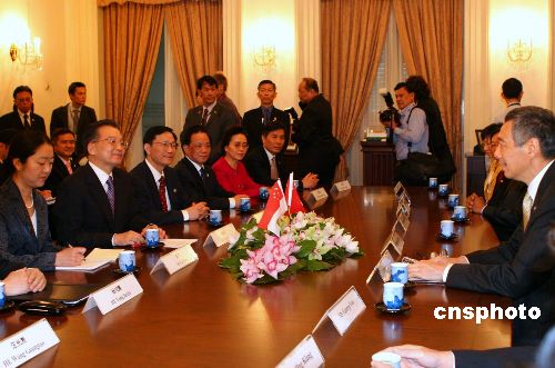 中國國務院總理溫家寶十一月十八日在此間與新加坡總理李顯龍舉行會談。雙方在友好、務實的氣氛中就進一步加強兩國互利合作達成多項重要共識。中新社發 周群 攝