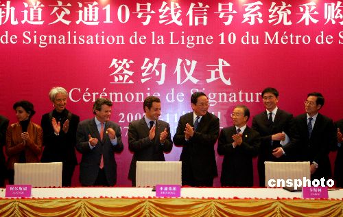 11月27日,中共中央政治局委員、上海市委書記俞正聲(右四),與在上海訪問的法國總統尼古拉·薩科齊(左四),共同出席上海申通地鐵集團公司與法國阿爾斯通公司關于上海軌道交通10號線信號系統采購合同簽約儀式。中新社發 湯彥俊 攝