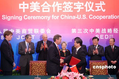 十二月十一日,中美雙方在北京釣魚臺國賓館舉行中美合作簽字儀式,中國國務院副總理吳儀、美國財政部長鮑爾森、商務部長古鐵雷斯等出席簽字儀式。中新社發 毛建軍 攝
