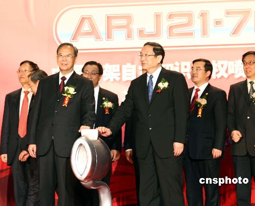 十二月二十一日,由中國航空工業第一集團公司(中國一航)自行研制生產的中國首架自主知識產權噴氣支線客機ARJ21-700飛機,在上海飛機制造廠順利實現總裝下線。中國國務院副總理曾培炎(前排左)和中共中央政治局委員、上海市市委書記俞正聲(前排右)出席隆重的總裝下線儀式。中新社發 文音 攝