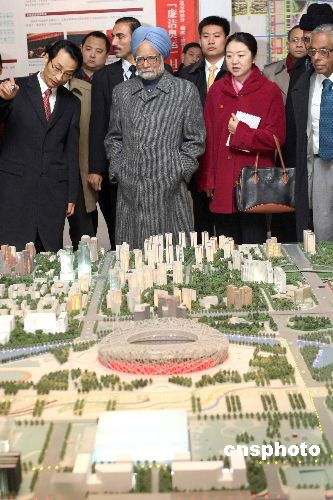 1月13日,印度總理辛格來到北京市“2008”工程展示中心,參觀2008年北京奧運會場館建設(shè)。這是辛格擔(dān)任印度總理以來首次訪問中國,也是時隔五年后印度總理再次來訪。中新社發(fā) 盛佳鵬 攝