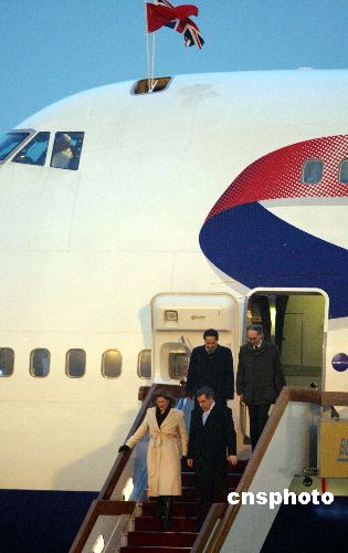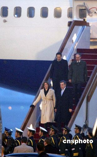 應中國國務院總理溫家寶邀請,英國首相戈登·布朗1月18日清晨乘專機抵達北京,開始對中國進行為期3天的正式訪問。這是布朗2007年6月就任英國首相以來首次訪華,隨行人員包括夫人沙拉·布朗,多位政府高級官員以及30余位隨行企業家。布朗也是2008年首位訪華的歐洲國家領導人。中新社發 盛佳鵬 攝
