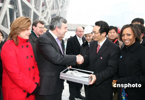 1月19日,英國首相布朗攜夫人薩拉·布朗以及英國著名女運動員、雅典奧運會冠軍凱莉·霍爾姆斯等,參觀2008年北京奧運會主體育場“鳥巢”。北京市副市長陳剛向布朗贈送了“鳥巢”模型。中新社發 盛佳鵬 攝