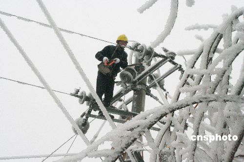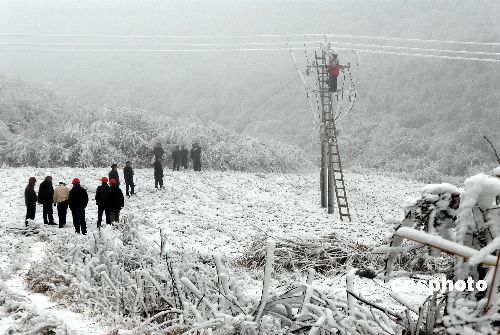 1月20至21日,黔東南州各縣電力職工在搶修受冰凍災(zāi)害的電力設(shè)施。連日來(lái),由于持續(xù)出現(xiàn)大范圍雪凝天氣,貴州省黔東南州境內(nèi)的凱里電網(wǎng)(轄管黔東南州各縣市)遭遇自1984年以來(lái)最為嚴(yán)重的冰凍災(zāi)害,凱里電網(wǎng)部門(mén)及下屬的15家縣局已緊急采取措施,確保電網(wǎng)穩(wěn)定運(yùn)行。1月14日以來(lái),貴州黔東南地區(qū)溫度均在零下1攝氏度,是24年以來(lái)最為嚴(yán)重的一次,出現(xiàn)嚴(yán)重的覆冰。覆冰導(dǎo)致一些輸電設(shè)施桿塔和導(dǎo)地線不堪重負(fù)而倒塔斷線,電網(wǎng)設(shè)施受損嚴(yán)重。截止1月21日,凱里電網(wǎng)出現(xiàn)孤網(wǎng)運(yùn)行,各縣農(nóng)網(wǎng)線路等輸配電線路都不同程度出現(xiàn)倒桿斷線的情況,造成黔東南州南部電網(wǎng)七個(gè)縣全部停電。冰災(zāi)發(fā)生后,凱里電網(wǎng)部門(mén)迅速啟動(dòng)“抗冰保電”應(yīng)急預(yù)案,同時(shí)在當(dāng)?shù)孛襟w發(fā)布停電預(yù)警公告,并積極做好醫(yī)院、交通、通訊、礦山等重要客戶(hù)的安全用電工作。中新社發(fā) 吳如雄 攝