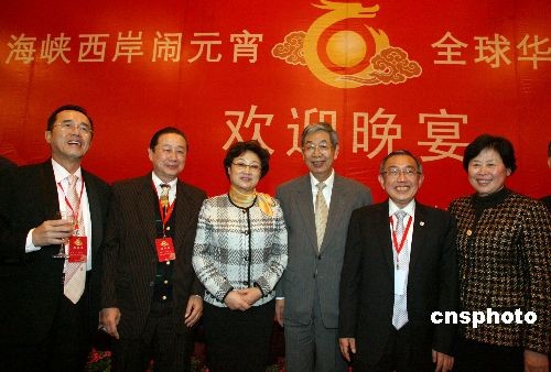 2月18日晚,中國國務(wù)院僑務(wù)辦公室、福建省人民政府和海峽兩岸關(guān)系協(xié)會(huì)在福州市舉辦晚宴,熱烈歡迎來閩參加“海峽西岸鬧元宵 全球華人盼團(tuán)圓”活動(dòng)的海外華僑華人、港澳同胞和臺(tái)灣同胞代表。全國人大常委會(huì)副委員長許嘉璐,國務(wù)院僑務(wù)辦公室主任李海峰,福建省人大常委會(huì)副主任王美香,福建省人民政府副省長洪捷序,福建省政協(xié)副主席張帆等出席了歡迎晚宴。圖為全國人大常委會(huì)副委員長許嘉璐、國務(wù)院僑務(wù)辦公室主任李海峰與嘉賓合影祝酒。中新社發(fā) 張勤 攝