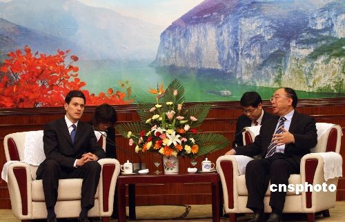 2月26日,英國外交大臣戴維·米利班德一行抵渝進行訪問。據(jù)稱,此次訪問重點是了解重慶市政府在縮小城鄉(xiāng)差距領域所作出的努力,戴維·米利班德一行將實地走訪重慶建筑工地和農(nóng)村,了解當?shù)剞r(nóng)民、農(nóng)民工及其子女的生活教育狀況。圖為重慶市常務副市長黃奇帆(右一)會見戴維·米利班德(左一)。中新社發(fā) 郭晉嘉 攝