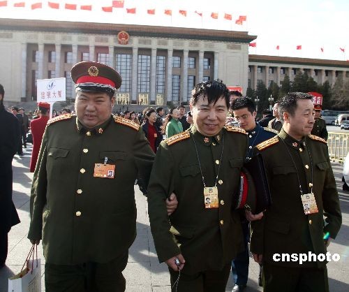 3月2日,全國政協十一屆一次會議預備會在北京人民大會堂舉行,毛澤東之孫、全國政協新委員毛新宇(左一)參加會議后,與其他委員相扶走出大會堂。中新社發 盛佳鵬 攝