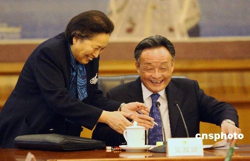 3月3日,十屆全國(guó)人大常委會(huì)在北京舉行最后一次委員長(zhǎng)會(huì)議。吳邦國(guó)委員長(zhǎng)會(huì)前與何魯麗副委員長(zhǎng)輕松交談。會(huì)上,委員長(zhǎng)會(huì)議聽取關(guān)于十一屆全國(guó)人大一次會(huì)議主席團(tuán)和秘書長(zhǎng)名單草案審議情況的匯報(bào),決定將名單草案提請(qǐng)十一屆全國(guó)人大一次會(huì)議預(yù)備會(huì)議選舉。中新社發(fā) 張宇 攝