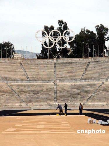 北京奧運(yùn)會(huì)圣火采集和火炬?zhèn)鬟f的籌備工作正在希臘緊張地進(jìn)行中。圖為雅典第一屆現(xiàn)代奧運(yùn)會(huì)會(huì)場(chǎng)正在為即將于本月底舉行的火炬交接儀式做準(zhǔn)備,工人正在體育場(chǎng)中心鋪設(shè)奧運(yùn)五環(huán)標(biāo)志。該體育場(chǎng)能容納兩萬人。中新社發(fā) 鐘誠(chéng) 攝