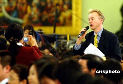 三月十二日上午,十一屆全國人大一次會議在北京人民大會堂舉行記者招待會,中外記者踴躍發問。中新社發 王東明 攝