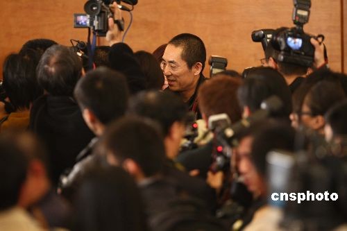 3月12日,全國政協十一屆一次會議記者招待會在北京人民大會堂新聞發布廳舉行,主題是“政協委員談奧運”。著名導演、北京奧組委開幕式總導演張藝謀在發布會結束后被媒體重重包圍,難于脫身。中新社發 盛佳鵬 攝