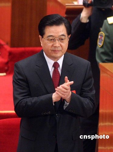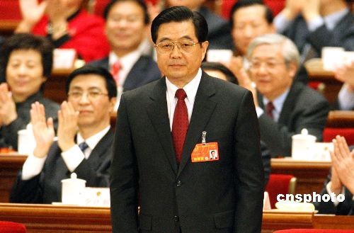 3月15日上午,十一屆全國人大一次會議第五次全體會議在北京人民大會堂舉行,胡錦濤再次當選中華人民共和國主席、中華人民共和國中央軍事委員會主席。中新社發 張宇 攝