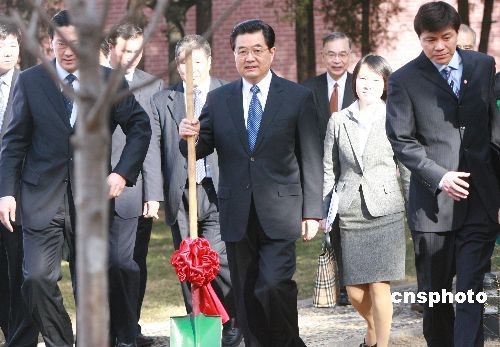 三月十五日,中國國家主席胡錦濤在北京的中國人民大學出席中日青少年友好交流活動開幕式。會后,胡錦濤與新一屆中日友好21世紀委員會日方首席委員小林陽太郎在校園內共同種植了一棵櫻花樹和一棵玉蘭樹。中新社發 廖文靜 攝