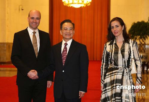 4月14日,中國國務院總理溫家寶在北京人民大會堂舉行儀式,歡迎來訪的瑞典首相賴因費爾特。中新社發 盛佳鵬 攝