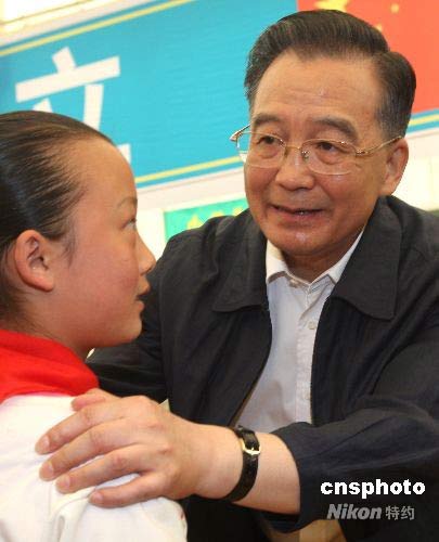 圖:溫家寶到綿陽帳篷學校看望災區學生