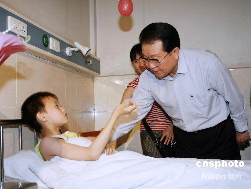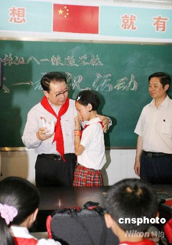 中共中央政治局常委李長春,6月1日赴四川災區看望慰問災區兒童,向災區轉移安置和受傷治療的學生轉交中央宣傳文化部門贈送的十萬臺收音機和一批少兒讀物及學習用品。中新社發 蒲滔 攝