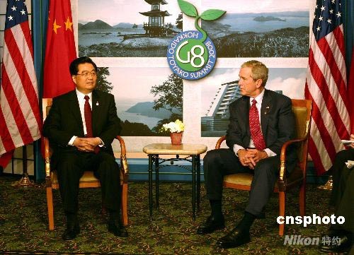正在日本北海道出席八國(guó)集團(tuán)同發(fā)展中國(guó)家領(lǐng)導(dǎo)人對(duì)話會(huì)的中國(guó)國(guó)家主席胡錦濤,當(dāng)?shù)貢r(shí)間7月9日下午會(huì)見美國(guó)總統(tǒng)布什,雙方就中美關(guān)系和其他共同關(guān)心的問題深入交換了意見。布什還表示,希望得到美國(guó)和中國(guó)的奧運(yùn)會(huì)籃球比賽的門票。他笑著對(duì)胡錦濤說:“如果您能幫我搞到票的話,我將非常感激! 中新社發(fā) 張朔 攝
