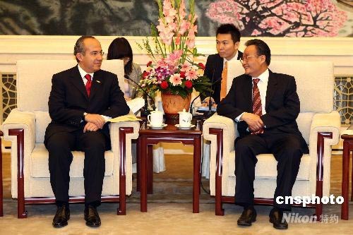 7月11日,中國(guó)全國(guó)人大常委會(huì)委員長(zhǎng)吳邦國(guó),在北京人民大會(huì)堂會(huì)見墨西哥總統(tǒng)卡爾德龍。中新社發(fā) 盛佳鵬 攝