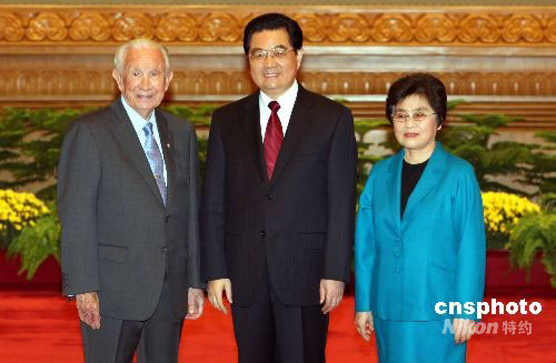 九月六日,中國(guó)國(guó)家主席胡錦濤和夫人劉永清在北京人民大會(huì)堂歡迎出席2008年殘奧會(huì)的各國(guó)貴賓。圖為胡錦濤夫婦與國(guó)際奧委會(huì)名譽(yù)主席薩馬蘭奇先生合影。中新社發(fā) 任海霞 攝