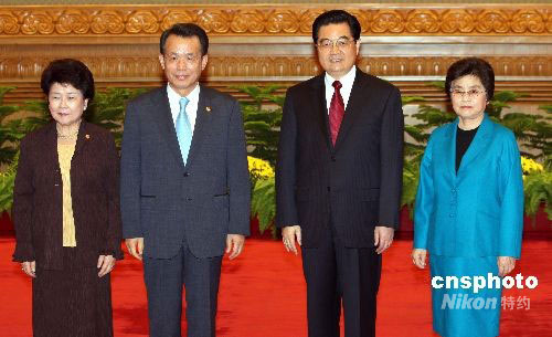 9月6日,國家主席胡錦濤夫婦在北京人民大會堂歡迎出席2008年殘奧會的各國貴賓。中新社發 任海霞 攝