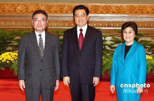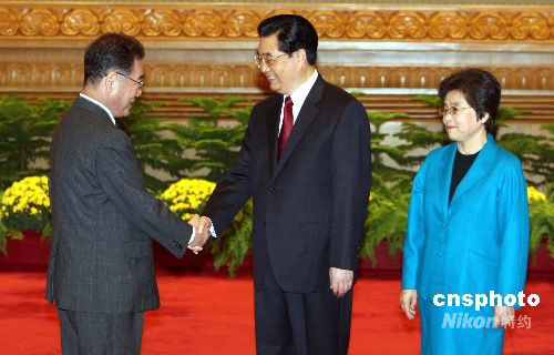 9月6日,國家主席胡錦濤夫婦在北京人民大會堂歡迎出席2008年殘奧會的各國貴賓。圖為胡錦濤夫婦歡迎日中友好協會會長加藤弘一先生。中新社發(fā) 任海霞 攝