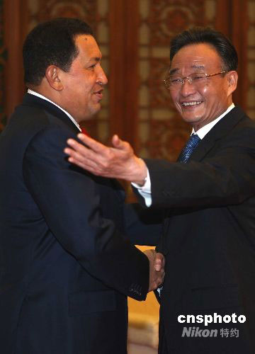 9月24日下午,中國全國人大常委會委員長吳邦國在北京人民大會堂會見來訪的委內瑞拉總統查韋斯。中新社發 任晨鳴 攝